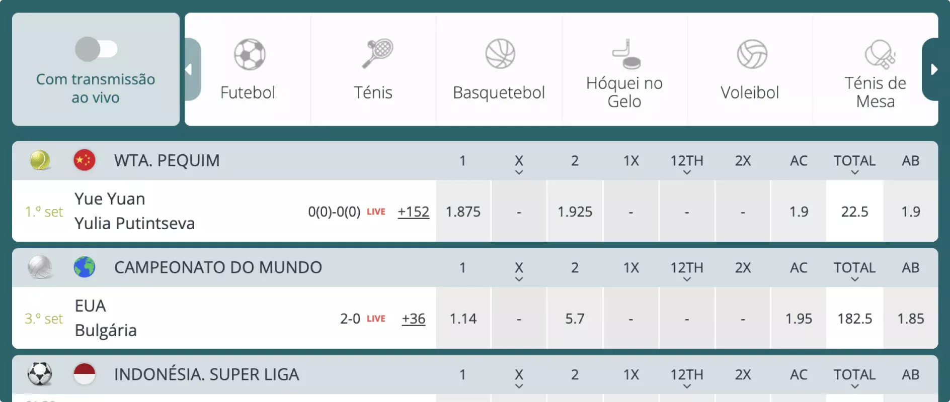 ténis, basquetebol, hóquei no gelo, voleibol, eSports, entre muitas outras. Cada modalidade apresenta,